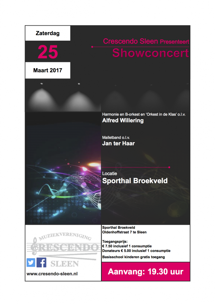 Het showconcert wordt gehouden op zaterdag 25 maart, in sporthal “Broekveld” te Sleen. De avond begint om 19:30 uur en de zaal is open vanaf 19:15 uur. De entree bedraagt € 7,50 ( incl. consumptie) en voor donateurs € 5,00 ( incl. consumptie)