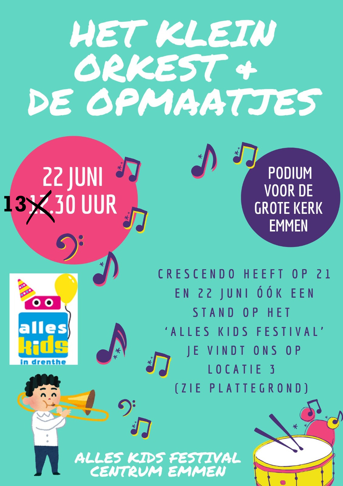 Op zondag 22 juni treden de opleidingsorkesten van muziekvereniging Crescendo Sleen en Excelsior Oosterhesselen op, op het grote podium van Alles Kids Festival Emmen! Bij de grote kerk in hartje Emmen staat het podium opgesteld. Op zondagmiddag om 13:30 uur zal het een groot feest worden voor De Opmaatjes en Het Klein Orkest om voor zoveel publiek te mogen schitteren. Ze spelen bekende hits, zoals ‘Engelbewaarder’ en ‘Amsterdam’. Dat wordt meezingen en dansen voor het publiek!