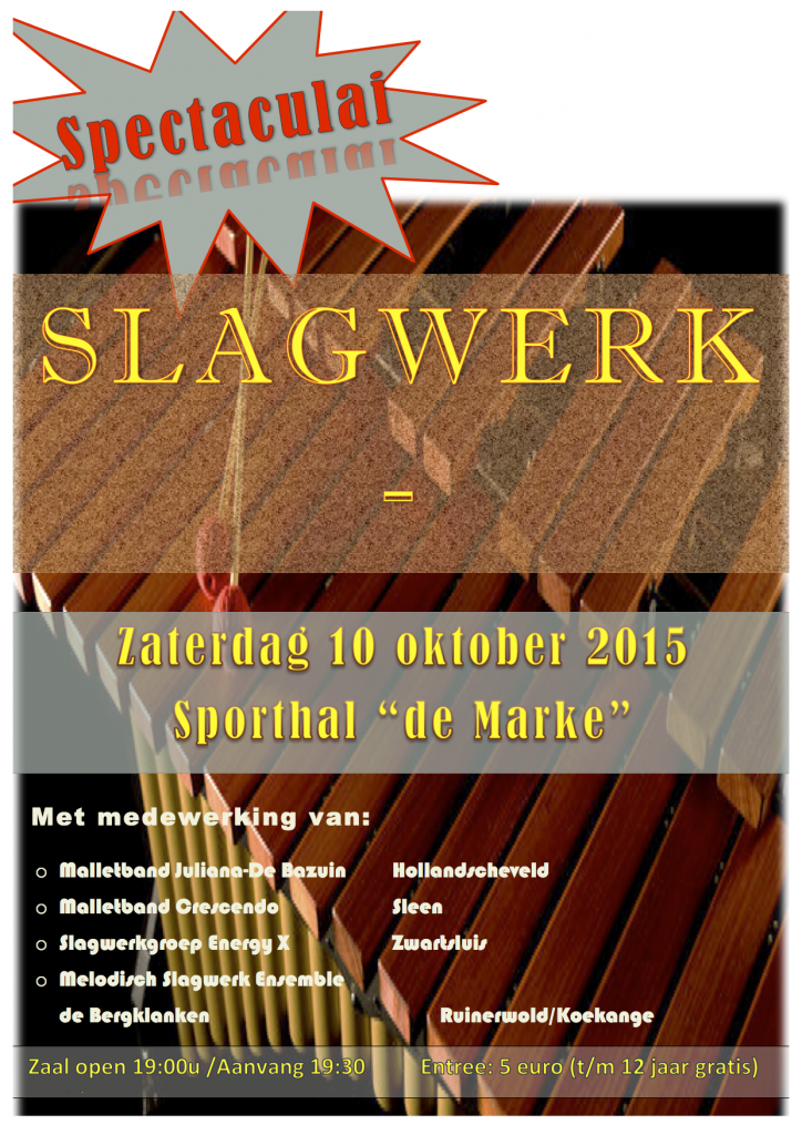 Voor de vierde zal het slagwerkevent in Hollandscheveld plaatsvinden. Dit keer op zaterdag 10 oktober 2015.